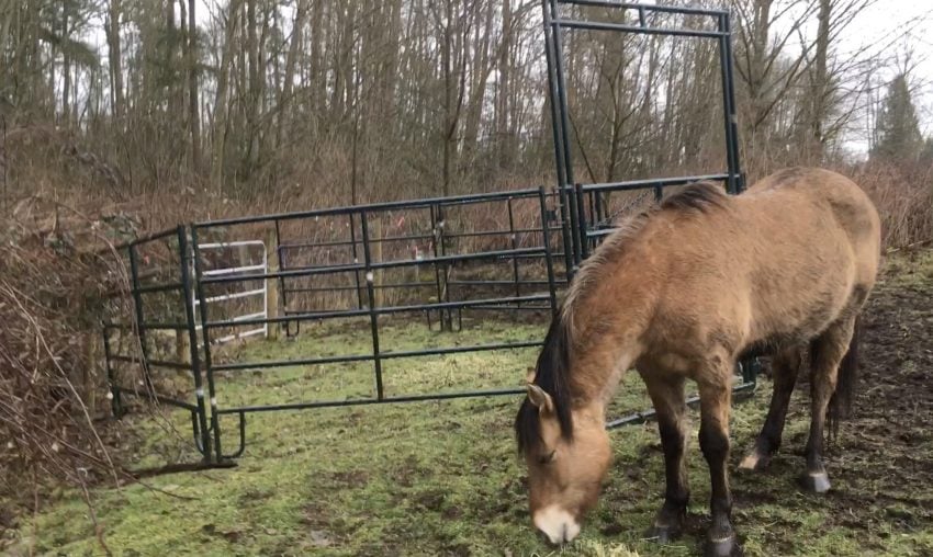 A month ago, I erected a corral-pen area just in front of the gate that leads to this unfenced section of land. This is designed to give me a ‘holding tank’ where I can have just one or two horses in the pen, close the pen gate, then open the fence gate to the back 20 acres. This means I can easily and non-stressfully separate 1 horse from a herd of 5 who would all LOVE to go back there!